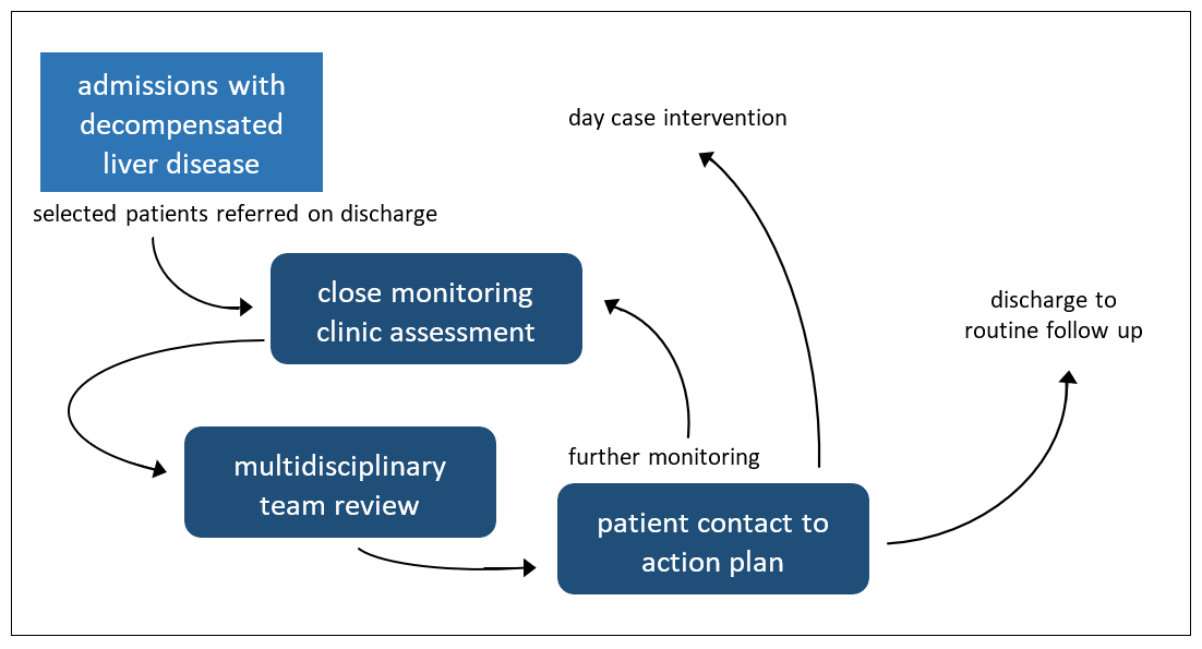 In 2019, the close monitoring clinic was set up in Aberdeen Royal Infirmary with aim of supporting patients with decompensated liver disease post-discharge. On discharge, consultants highlight patients for follow up in the close monitoring clinic based on clinic assessment of likelihood of decompensation. These selected patients are reviewed in 1-2 weeks at an outpatient specialist nurse-led clinic whose staff can examine perform clinical examinations, routine tests, modify prescriptions, and organise day case drains. It is further supported by a multidisciplinary team meeting attended by hepatology consultants who provide advice the following day. After multidisciplinary team review, patients are telephoned to action plans, e.g., diuretic doses, laxative changes, electrolyte management.