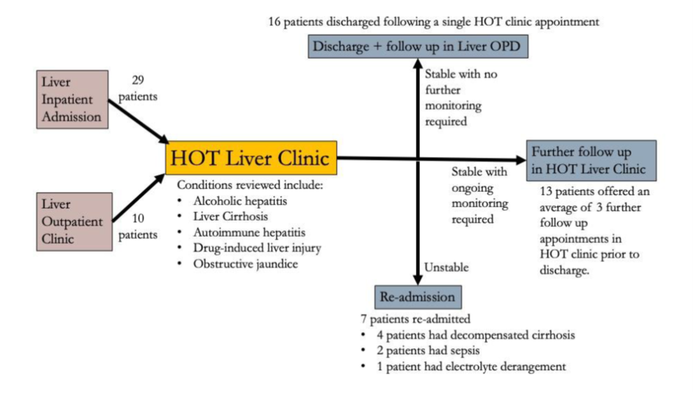 We implemented a HOT liver clinic to review patients following inpatient admission or outpatient review. The primary aim of this clinic was to reduce LOS amongst liver patients by providing early clinical review and to minimise emergency admissions amongst liver outpatients.