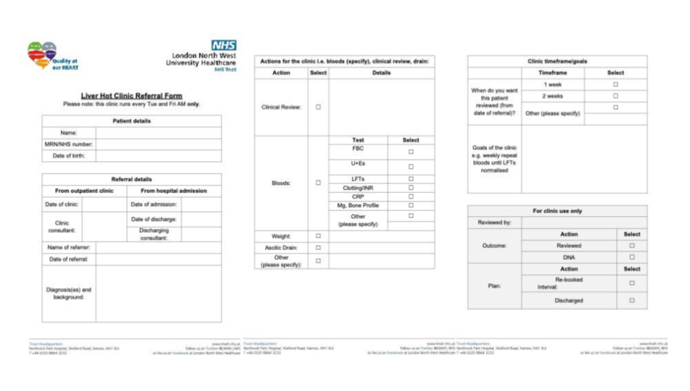 Northwick Park Hospital serves an ethnically diverse population in the London boroughs of Brent and Harrow. Brent, being the 10th most deprived borough in London, has a high burden of liver disease, which is associated with significant healthcare resource utilisation, morbidity and mortality. A GIRFT review conducted in 2023 showed that the emergency liver-admission rate at our trust was 41.6%, which is significantly higher than the benchmark of 37.2%.