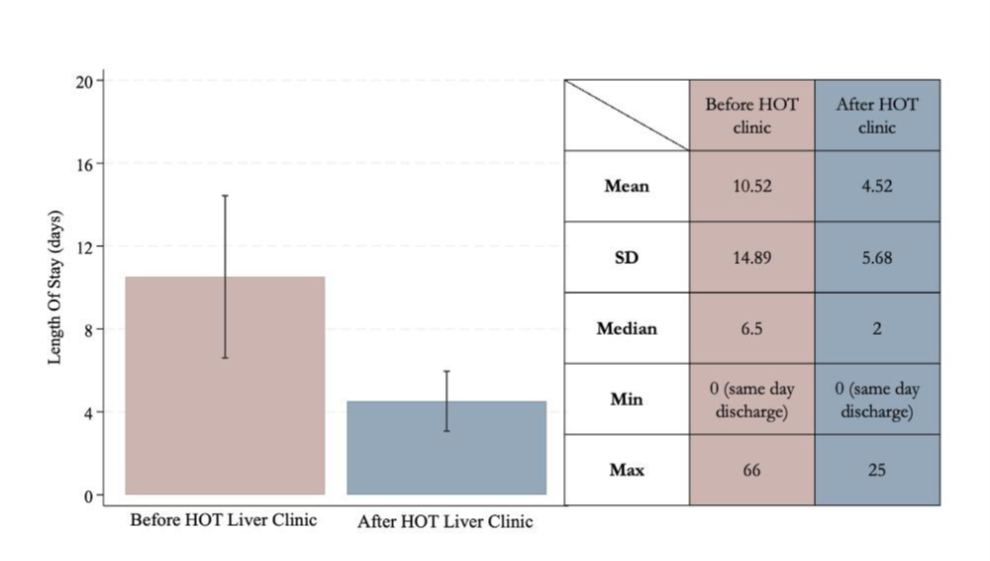 Implementation of a HOT liver clinic reduces length of stay in hospital, allowing for resource optimisation and cost savings.