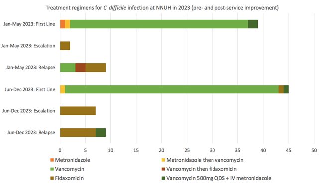 From June to December 2023, 45 patients were offered first-line treatment. This consisted of vancomycin alone in 41 cases, high-dose vancomycin with intravenous metronidazole in one case with severe colitis, oral metronidazole followed by vancomycin in one case, and fidaxomicin in one case. 7 patients (15.5%) were escalated to fidaxomicin due to suboptimal response to first-line treatment. There were 9 confirmed cases (20%) of relapse within 12 weeks: 7 treated with fidaxomicin and 2 treated with a combination of high-dose vancomycin plus intravenous metronidazole due to fulminant colitis.