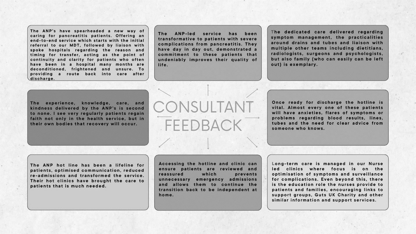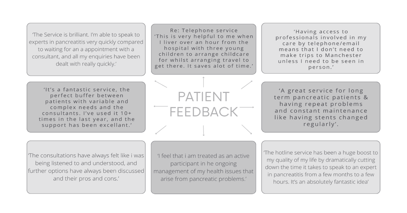 Patient and Consultant feedback was sought through electronic survey. Seventy eight percent of patients agreed they were aware of how to contact the team for support. Patients were asked where they would previously have sought help. Thirty percent said they would have attended the emergency department, 25% would have contacted their GP, 30% would have tried their consultant’s secretary and 15% would have turned to alternative sources including the internet and support groups. One hundred percent agreed they felt supported by the service. Seventy-seven percent said they felt involved in the management of their illness. Ninety-nine percent agreed they received information about their illness. Sixty-six percent of patients felt their pancreatitis was adequately managed by the nurse led service and 33% were undecided. Seventy-seven percent agreed that the telephone clinic interferes less with work, family, and social life. One hundred percent agreed the telephone clinic saved on transport costs. However, 11% said they would prefer to be reviewed face to face and 55% were undecided. Patient’s comments explaining the responses to questions and Consultant feedback has been positive describing the impact of the service (Figure’s 1 & 2.)