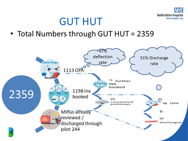 The primary outcome was to reduce the overall waiting lists. In total 2359 patients were reviewed in GUT HUT over an 18-month period, 1113 patients were sent to outpatient clinic which was a 47% decrease in outpatient numbers; 1198 were referred for investigation and 224 were directly discharged. Following investigations a further 447 patients were directly discharged which resulted in an overall discharge rate of 51%. We received no complaints from patients or GPs regarding the safety or effectiveness of the service and our audit showed that the GUT HUT was safe and effective. To highlight the impact of Gut Hut, when the service was paused for a couple of weeks due to annual leave there was an exponential rise in routine OPA.