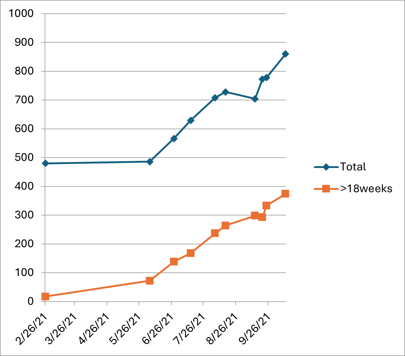 Figure 1: Patients waiting greater than 18 weeks and total number of referrals February 2021 to September 2021