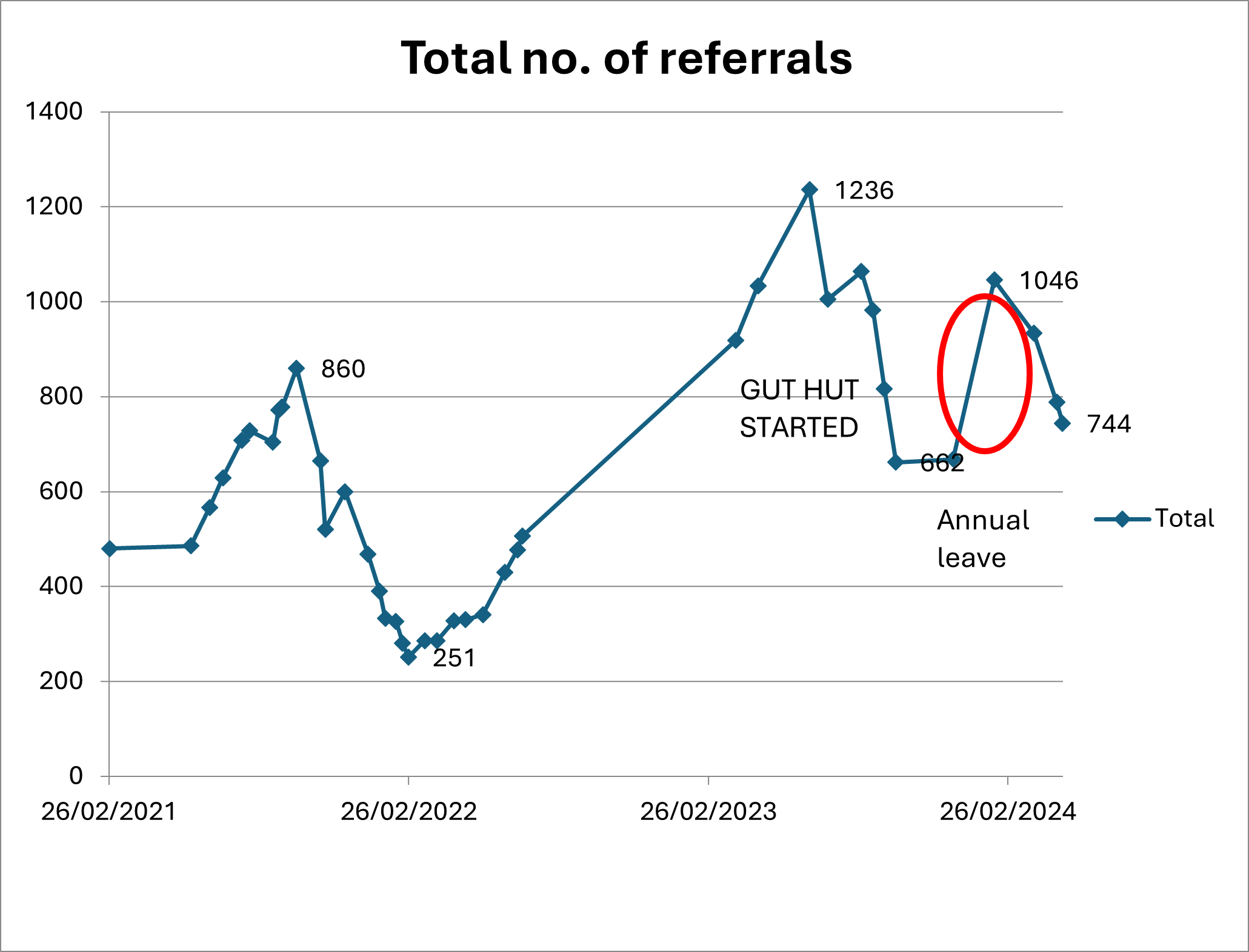 The details regarding the GUT HUT pathway and data were presented to our local GPs and the feedback was well received. We also utilised this opportunity to highlight the importance of including all the relevant information, investigations and if the patient would agree to an invasive investigation such as an endoscopy.
