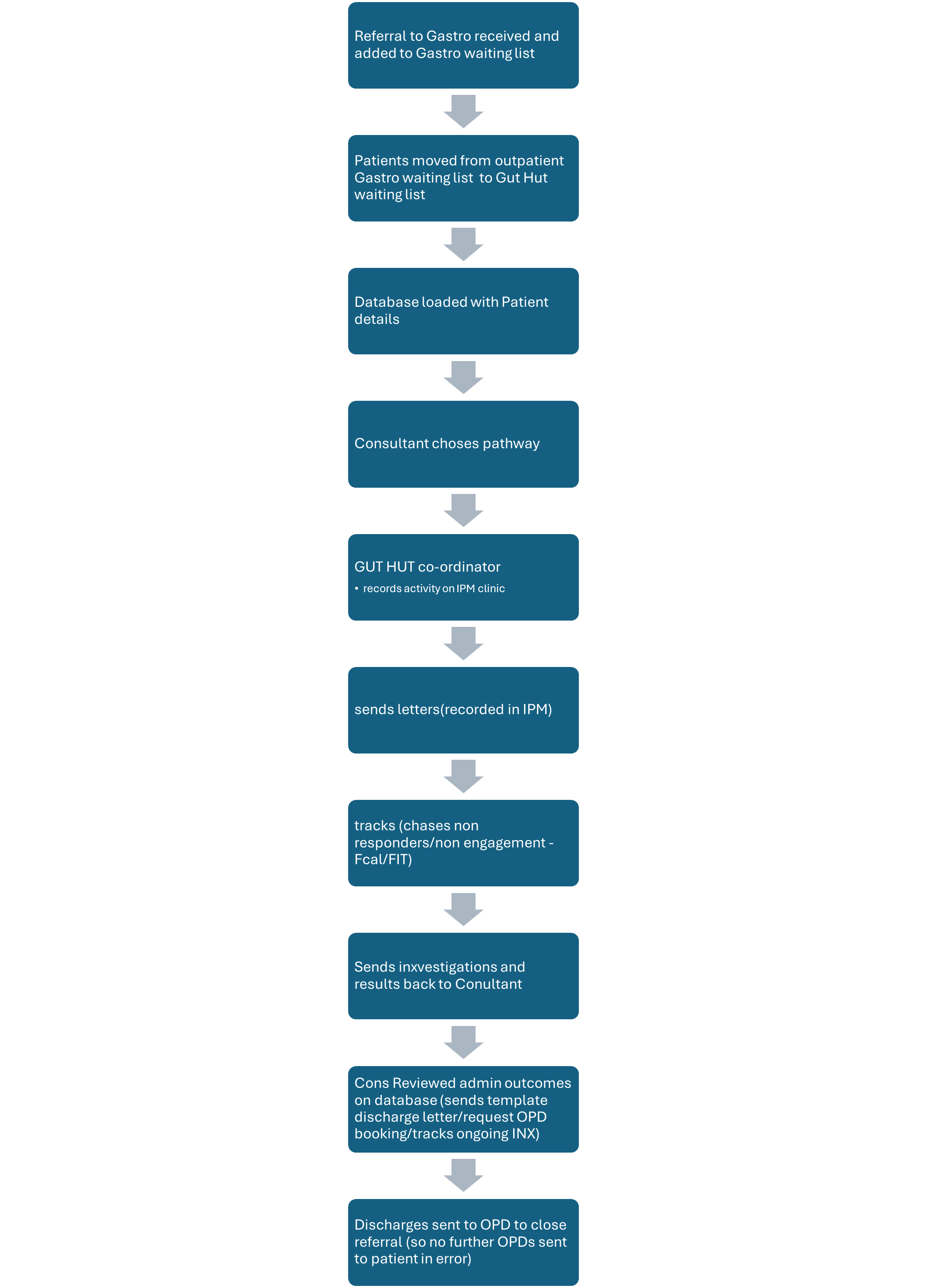 There were also several key events which impacted our ability to reduce the waiting list to include trainee departures in March 2021, which unfortunately we were unable to replace until September 2021. Furthermore, the long-term locum gastroenterologist left the Trust in June 2021 which we were unable to replace and lastly, we encountered difficulties recruiting new consultants into position. Due to the increased turn around in staffing we needed to explore novel strategies to deal with the demands of the increasing waiting list. Further clinic sessions were limited by physical space to do the clinic, expense of setting these up and consultant availability to staff them. In view of this we created a unique triage GUT HUT service with the aim of remotely utilising a consultant in a 1PA capacity to review 30 patients per PA and appropriately triage them to various pathways using created template letters.