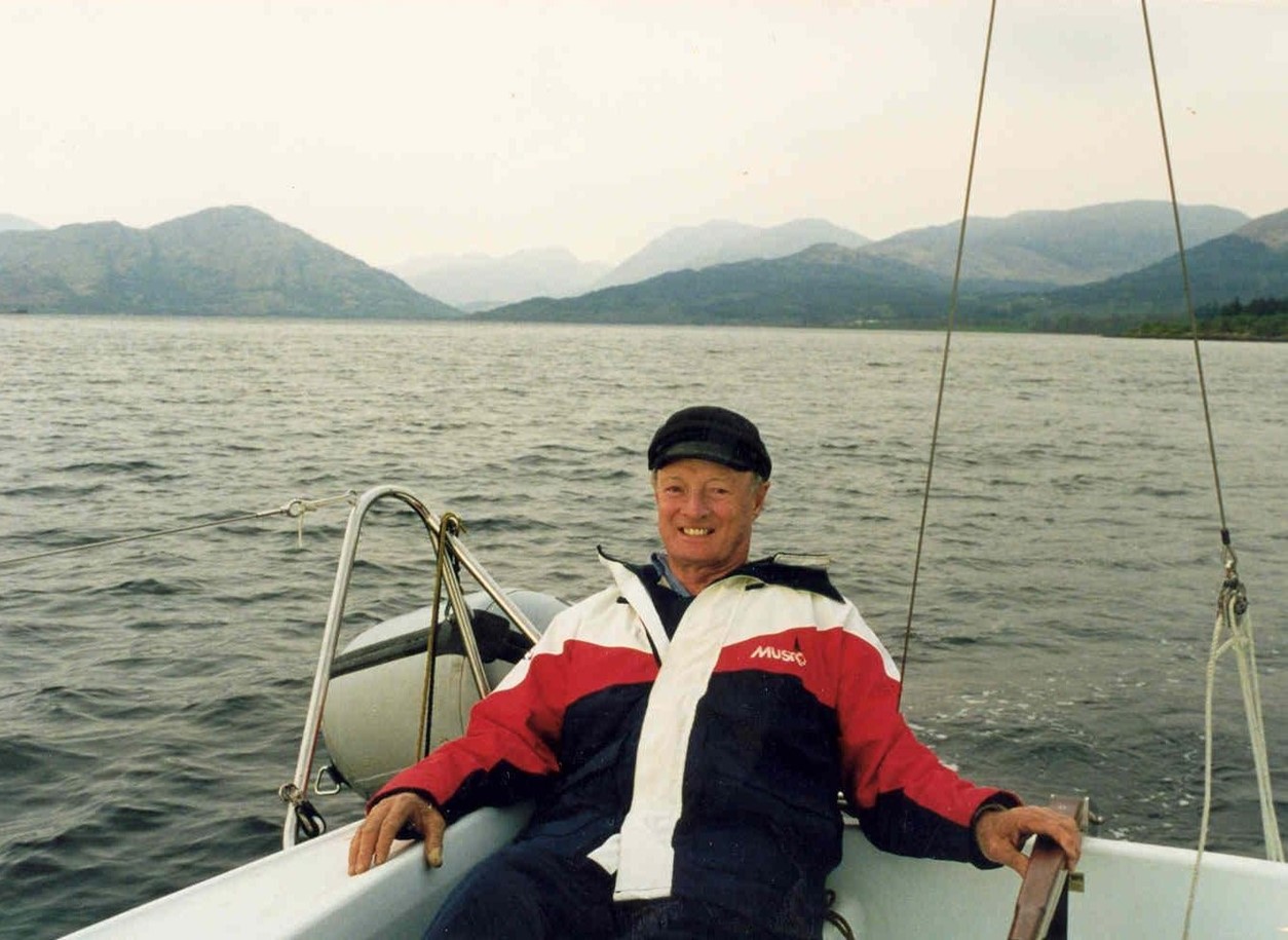 Mike Gear at the helm in his yacht on Loch Sunart, Scotland.